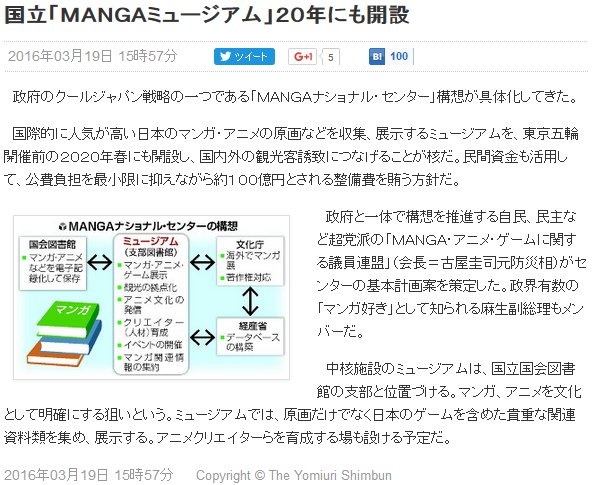今日は曇時々晴。読売[1]によると、政府のクールジャパン戦略の一環として、MANGAナショナル·センターの構想が具体化して来た模様。何処か、嘗て構想段階で潰えた国立メディア芸術総合センターを彷彿とさせる。似ている以上、今回のMANGAナショナル·センターの必要性に関する挙証責任が政府にはあるが、果たせるだろうか。