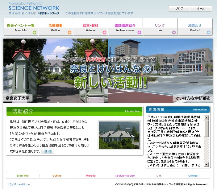 今日は晴。[1]は奈良女子大学がJSTの支援を得て、2009年度から2011年度まで実施した科学普及プロジェクト"まほろば·けいはんな科学ネットワーク"のホームページである。主として奈良市とその近隣地域に於いて子供向けに科学実験教室を開催する他、指導者の養成等の活動を行っていたが、