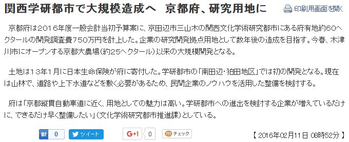 今日は晴。8/23にはけいはんな学研都市·高山第2工区に触れたが、毎日新聞[1]は有識者懇談があった事を報じている。市長は「住宅都市の一つのモデルを改めて作り上げ、生駒市、高山から全国に発信したい」と挨拶しているので、宅地が主目的か。それにしても長期的な人口減少が予想される中、開発しないと云う決断は不可能だろうか。 ところが、開発に向けた動きは高山第2工区だけではない。京都新聞[2]によれば、京都府は京田辺市三山木の関西文化学術研究都市にある府有地約60haの開発調査費750万円を計上した、とある。高山第2工区に加え、木津北·東地区の開発計画も頓挫。だがブレーキは掛からない。 ![]() [1]mainichi.jp/articles/20160901/ddl/k29/010/498000c ![]() [2]www.kyoto-np.co.jp/economy/article/20160211000023 | ||