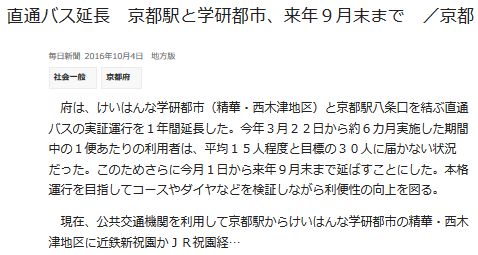 今日は晴。毎日新聞[1]は、京都府が、けいはんな学研都市(精華·西木津地区)と京都駅八条口を結ぶ直通バスの実証運行を1年間延長した、と報じている。理由は、これまで6ヶ月間運行して来たが、利用者が1便当り15人と、目標30人の半分の為。それにしても、盛況であれば運行期間を延長し、そうでなければ廃止するのが本道だ。お役所の考える事はこれだから分からない。